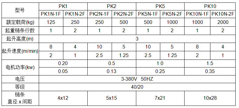 PK型電動葫蘆主要采用高強度輕金屬合金制造,具有結構緊湊、體積小、重量輕的優(yōu)點。PK型電動鏈式提升機的錐形轉子電機根據(jù)自制動原理,具有常速、快速和精升速等多種形式。在正齒輪減速器中,第二傳動齒輪配有摩擦安全聯(lián)軸器,使電動葫蘆不承受極端過載,高強度、高耐磨的鋼鏈能夠平穩(wěn)、安全地提升。因此,它是非常安全可靠的。